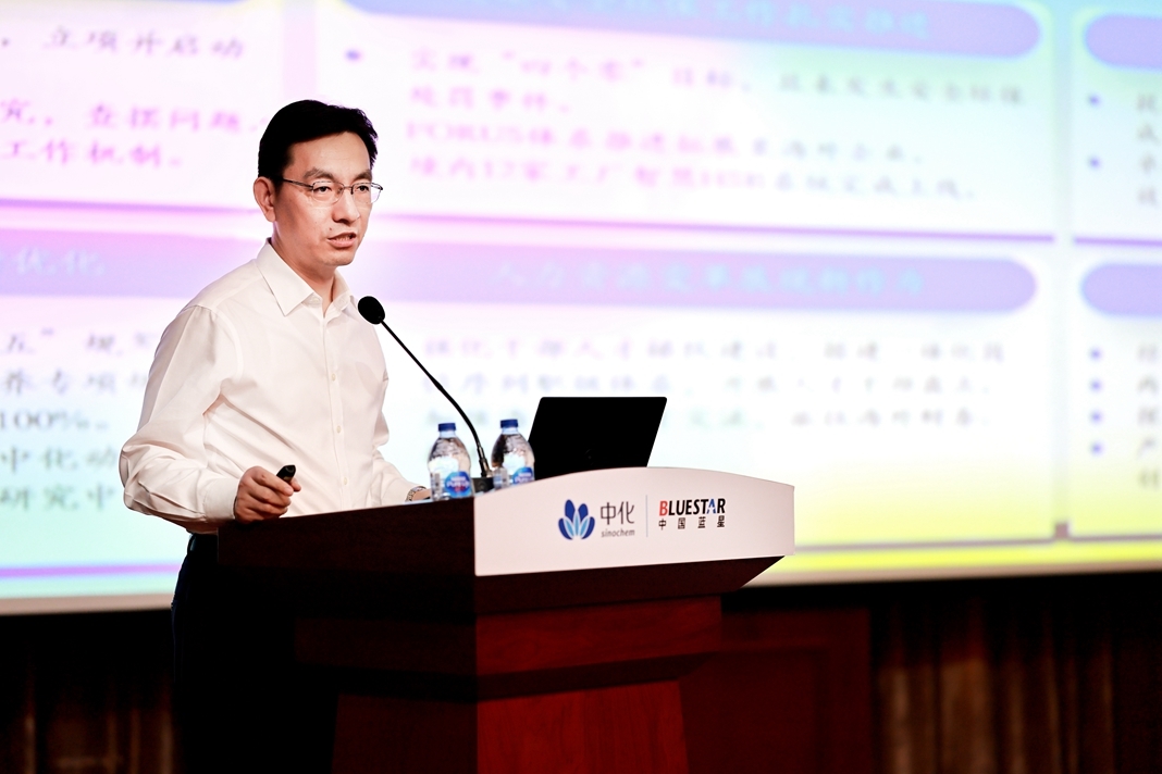 藍星公司黨委書記、董事長郝志剛以《黨建統領 銳意改革 提質增效 全力打造全球領先的化工新材料和特種化學品企業》為題作重要講話。藍星公司黨委副書記、副總經理董大川主持會議。藍星公司總部全體員工、各級直屬企業領導班子和各部門主要負責人、海外企業在華機構負責人及所屬企業管理團隊共268人分別在主會場和視頻分會場參會。